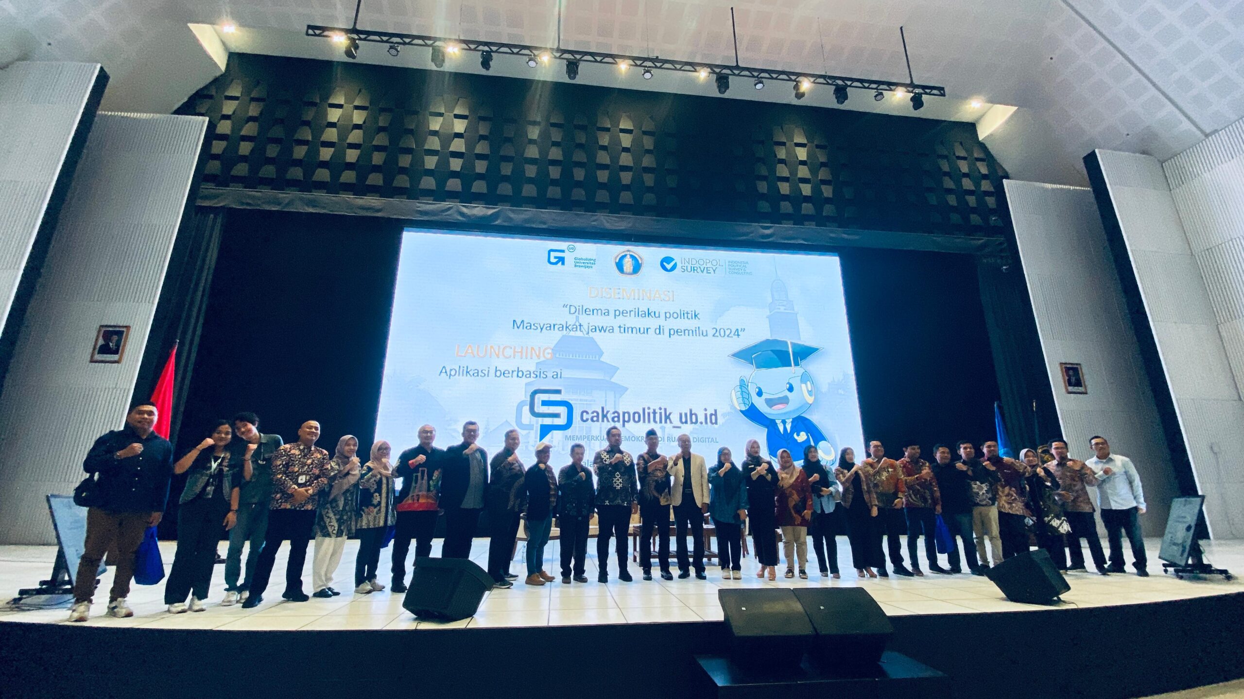 Malang, http://gajayanatvnews.com – Globalizing Universitas Brawijaya (UB) bersama Indonesia Political Survey dan Consulting (Indopol Survey) menunjukkan komitmen nyata terhadap pendidikan politik yang inklusif dan adaptif. Komitmen tersebut diwujudkan melalui peluncuran aplikasi berbasis kecerdasan buatan (AI) bernama CakapPolitik_UB.id. Aplikasi ini diperkenalkan dalam kegiatan diseminasi “Dilema Perilaku Politik Masyarakat Jawa Timur di Pemilu 2024” yang berlangsung di Auditorium UB, Rabu (12/11/2025).
