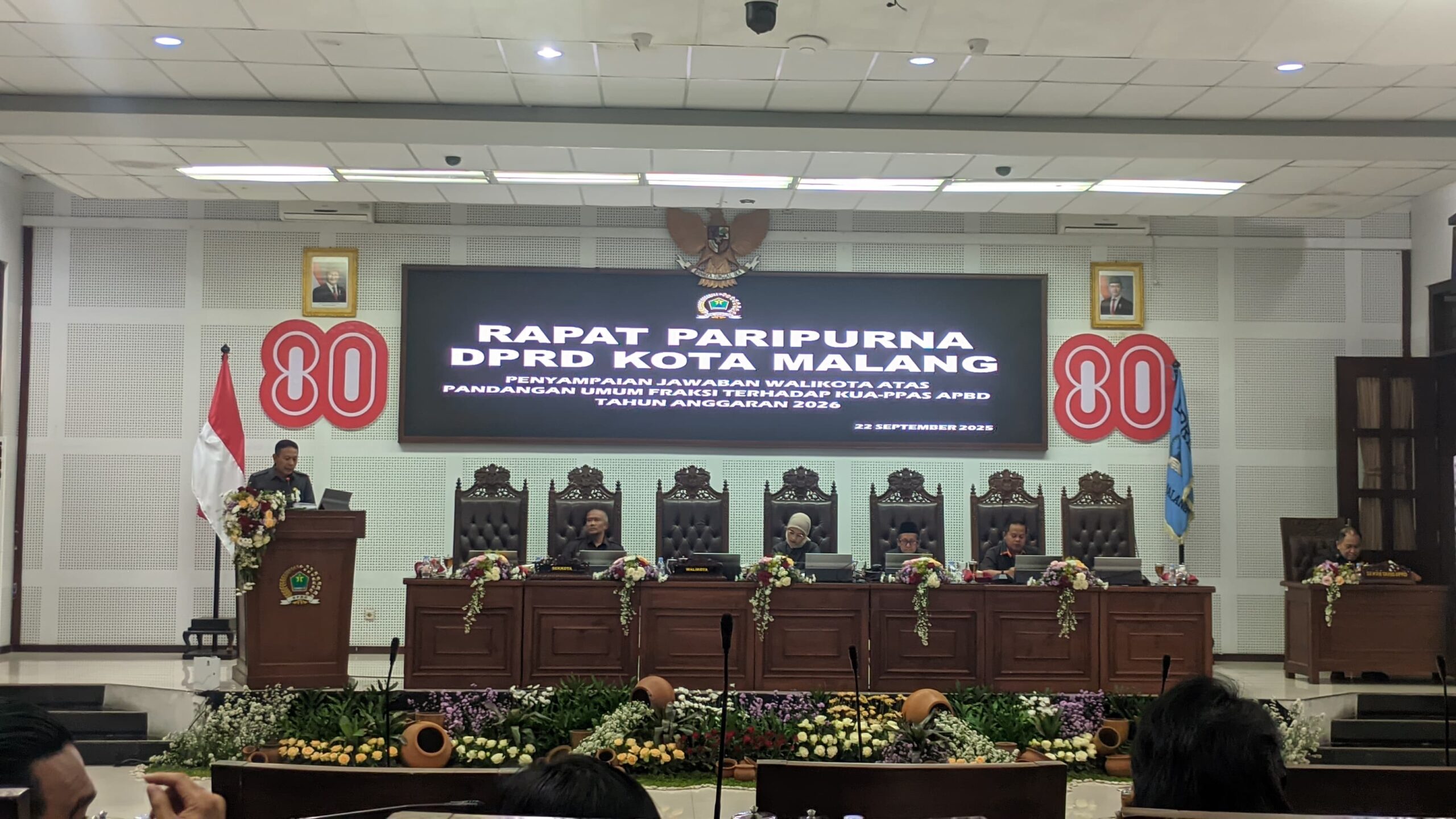 Malang, http://gajayanatvnews.com – Dewan Perwakilan Rakyat Daerah (DPRD) Kota Malang menggelar rapat paripurna dengan agenda penyampaian pandangan umum fraksi terhadap perubahan Anggaran Pendapatan dan Belanja Daerah (APBD) 2026. Acara ini dilaksanakan di gedung paripurna DPRD Kota Malang pada Senin (22/9/2025).