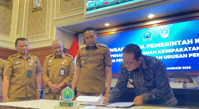 Malang, http://gajayanatvnews.com – Pemerintah Kota (Pemkot) Malang menerima kunjungan kerja Pemerintah Kota Jambi di Ruang Sidang Balai Kota Malang, Senin (12 Januari 2026). Kunjungan tersebut menjadi momentum penting dalam memperkuat sinergi antardaerah, yang ditandai dengan penandatanganan kesepakatan bersama terkait penyelenggaraan urusan pemerintahan.